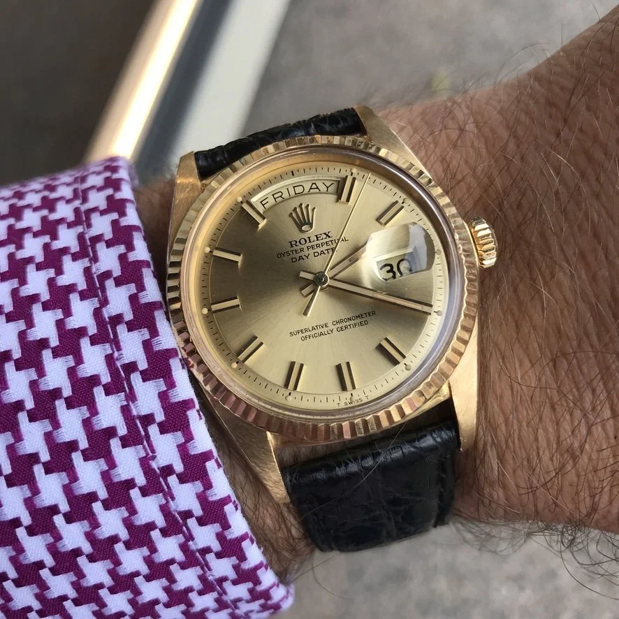 Example: 1970’s vintage 18K YG Rolex Day-Date “Wide Boy” dial and hands on strap.