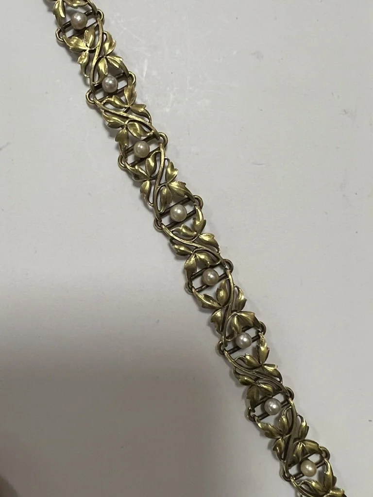 Example: 18K YG Art Nouveau elegant leaf motif natural pearl bracelet from C.1900 French.